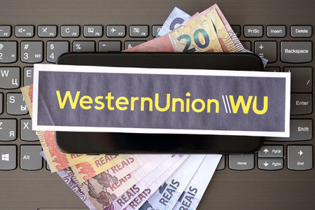 TERNOPIL, UKRAINE - SEPTEMBER 6, 2022 Western Union paper logotype lies on black laptop keyboard with brazilian reals bills. Western Union Company is an American multinational financial services company