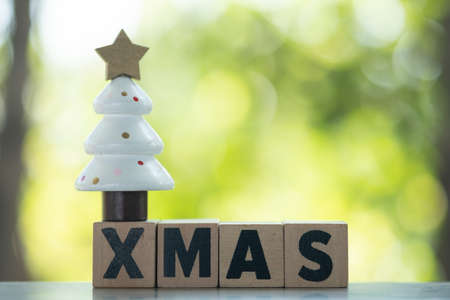 Miniature of Christmas tree on letters spelling XMAS. Festive Christmas concept