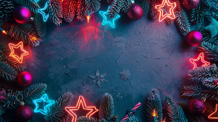 Festive holiday scene featuring vibrant neon lights and pine greenery with shiny ornaments. Perfect for Christmas-themed designs and seasonal celebrations.