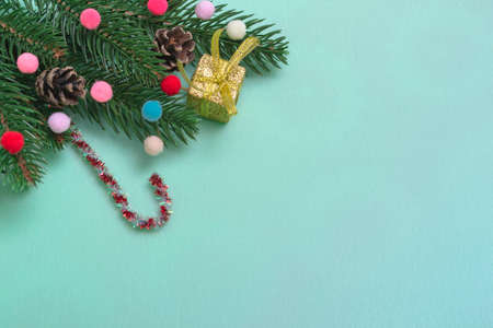 Christmas background with fir branches and Christmas decor. Top view, copy space for text.