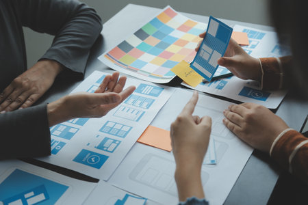 Close up ux developer and ui designer brainstorming about mobile app interface wireframe design on table with customer breif and color code at modern office.Creative digital development agency
