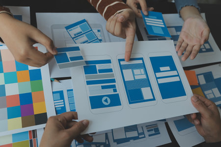 Graphic designers work together with UX UI designer planning application template layout framework for mobile phone computer mobile