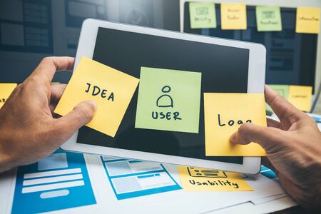 Close up ux developer and ui designer brainstorming interface wireframe design.Creative digital development agency