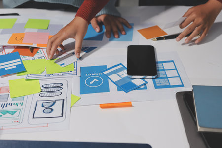 Close up ux developer and ui designer brainstorming about mobile app interface wireframe design on table with customer breif and color code at modern office.Creative digital development agency