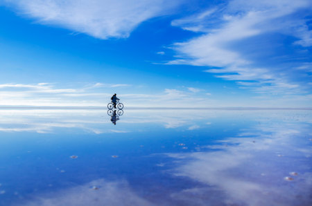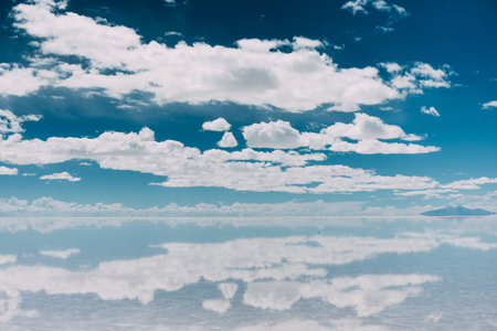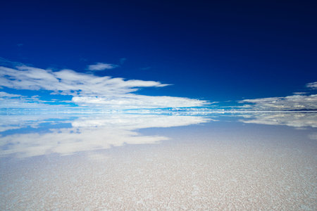 Panoramic photo of bolivian Salar de Uyuni, amazing place in South America. Surface with water makes a mirror.