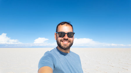 Bearded man tourist taking a selfie looking at camera in Uyuni salt flat Bolivia