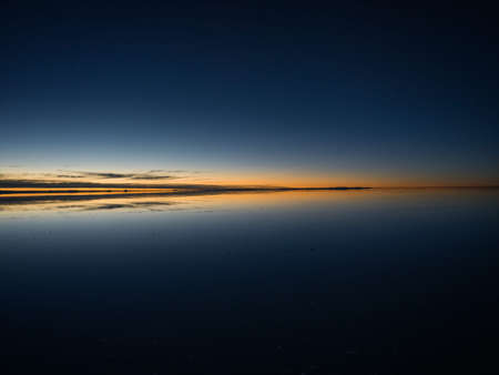 Andes mountains sunrise panorama mirror reflection on Salar de Uyuni salt flat lake in Potosi Bolivia, South America