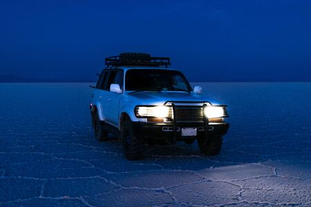 The car in the Uyuni salt flat, is located at an altitude of 4000 meters above sea level on the plateau of the Bolivian Altiplano