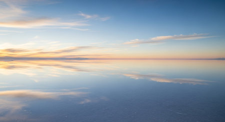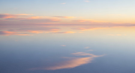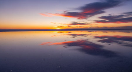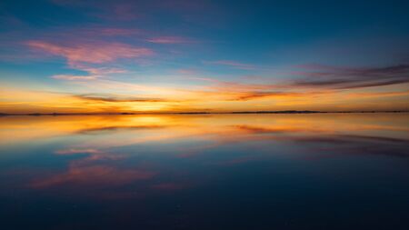 Sunrise on Salar de Uyuni in Bolivia covered with water, salt flat desert and sky reflections