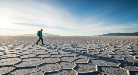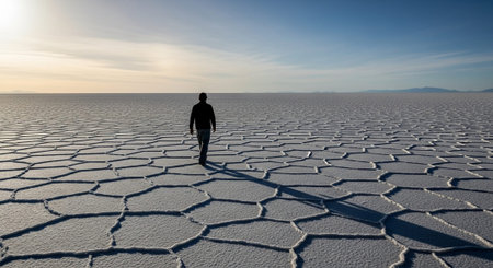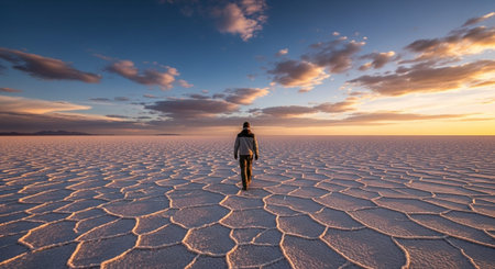 Tourist walking in sunshine Salar de Uyuni