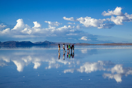 Tourists exploring the world famous Uyuni Salt Flat, among the most important travel destination in the Bolivian Andes. Wide angle view, clear blue sky.
