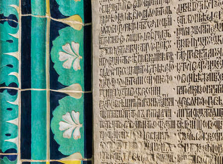ISTRA, RUSSIA - SEPTEMBER 12, 2017: Orthodox New Jerusalem Monastery. Fragment of stone slab with ancient text about construction of Resurrection (Voskresenskiy) Cathedral.