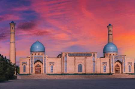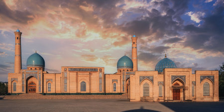 ancient medieval Muslim Islamic mosque Hazrati Imam in Tashkent in Uzbekistan at sunset. Complex Hast Imom