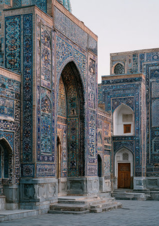 Ornate blue-tiled Islamic architecture showcasing an arched doorway and intricate patterns
