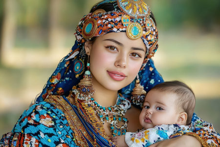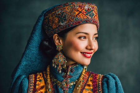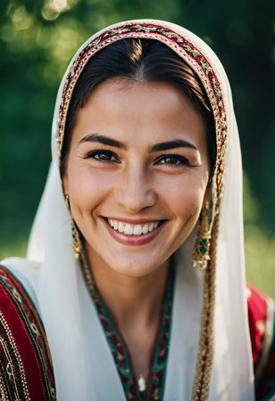 A Tajik woman 30 years old stands gracefully, showcasing her traditional attire against a breathtaking backdrop of defocused lush greenery, reflecting her cultural roots. Generated by AI.