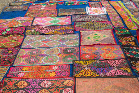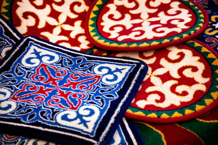 Ethnic oriental carpet with pattern in yurt at Asian market