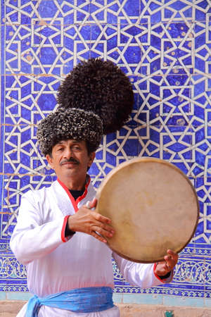 KHIVA, UZBEKISTAN - MAY 4, 2011: Traditional Uzbek musician performing at Tosh Hovli palace
