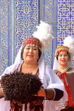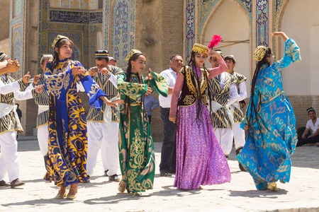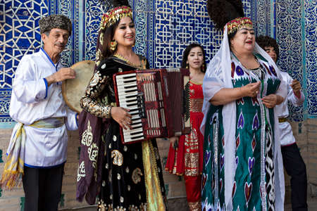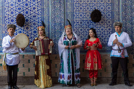 BUKHARA, UZBEKISTAN - MAY 25, 2018: Silk and Spices Festival 2018. Bukharian musicians in local dress dance, in Bukhara, Uzbekistan