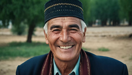 A joyful Tajik man 75 years old wearing traditional clothing stands outdoors with a broad smile against a natural backdrop on a sunny day. A resident of Tajikistan smiles. Generated by AI