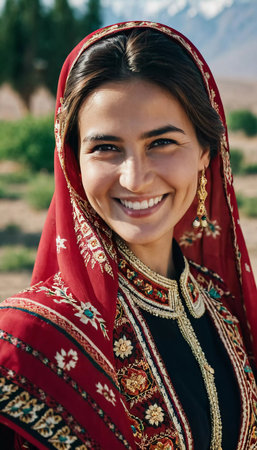 A joyful woman 45 years old from Afghanistan displays a bright smile while wearing traditional clothing. She stands confidently, embodying a sense of peace in her rural community. Generative AI.