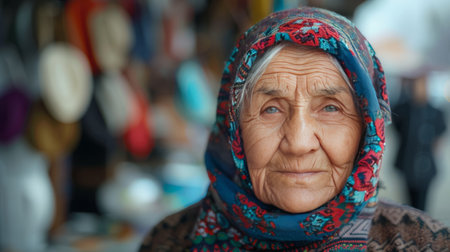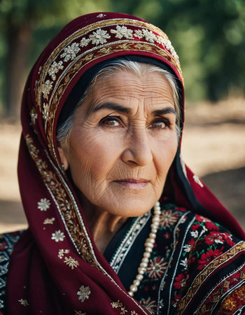 A mature Tajik woman 75 years old, gazes directly showcasing intricate traditional attire, rich cultural heritage of her nationality, evoking wisdom and grace. Brunette woman, wearing a headscarf. AI