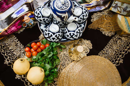 Quince fruits on a table decorated with oriental fabrics with ornaments and gold accents. The concept of oriental cuisine. Quince fruit, tomatoes and herbs are on the table.