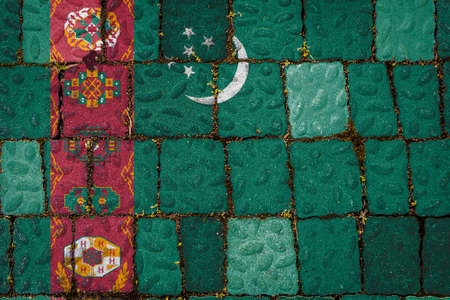 National flag of Turkmenistan on stone wall background. Flag banner on stone texture background.