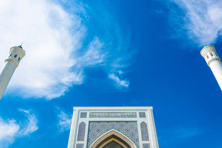 The top of the minaret of the mosque in Tashkent Minor against the blue sky, Uzbekistan.