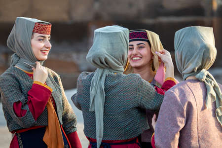 Ashgabat, Turkmenistan - May 25, 2017: Group of smiling female students in red national dresses with embroidery. Ashgabat, Turkmenistan, May 25, 2017.
