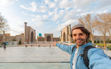 happy tourist take photo selfie with Registan in Samarkand, travel in Uzbekistan, Central Asia