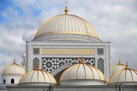 Shali, Chechnya Republic, Russia - September 10, 2021: White Mosque. Prophet Muhammad's Mosque called Pride of the Muslims made of white marble
