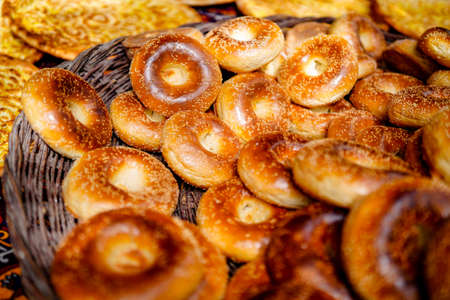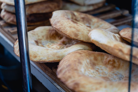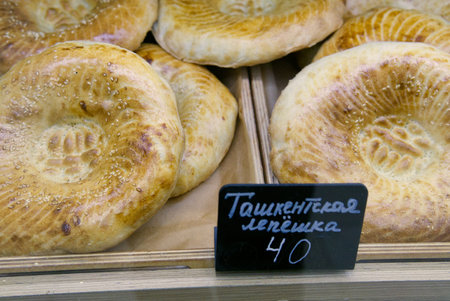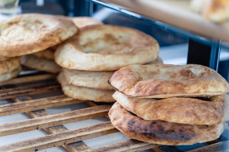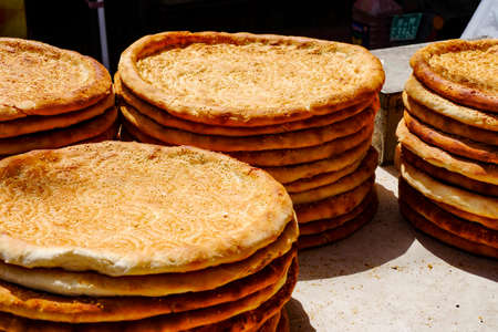 traditional Asian flatbread Kazakh tandoor bread on counter at the bazaar in Kazakhstan