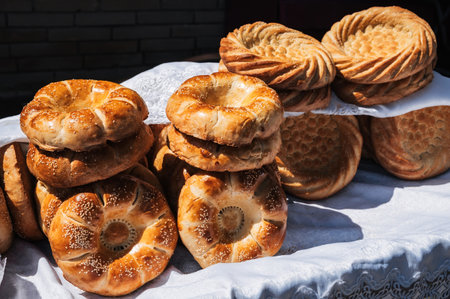traditional Asian bread Uzbek tandoor flatbread on the counter at bazaar in Uzbekistan