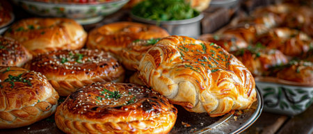 Turkish Bureks, Traditional Borek, Meat Filled Pie, Many Homemade Boureki Feta Buns Top View, Copy Space, Generative AI Illustration