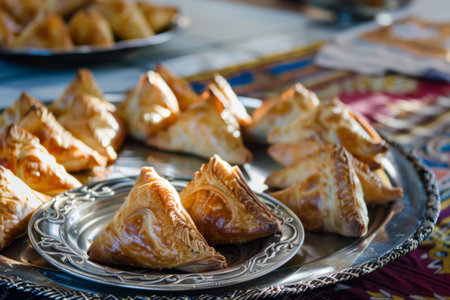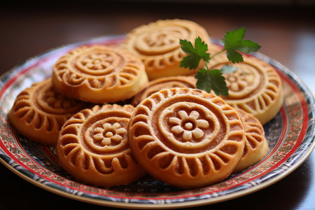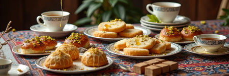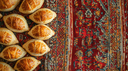 A beautiful arrangement of traditional pastries resting on intricate patterned fabric, capturing the essence of cultural cuisine and festive gatherings.