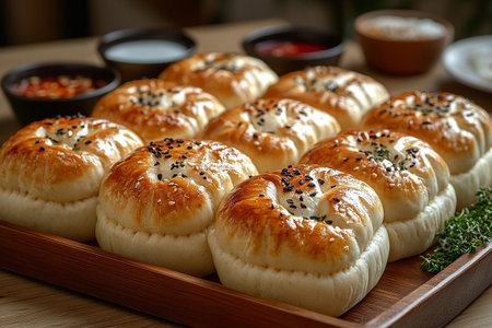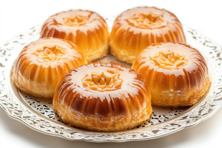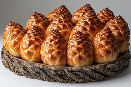 freshly baked goods displaying intricate floral patterns on the surface. The golden-brown pastries highlight detailed craftsmanship, AI generated