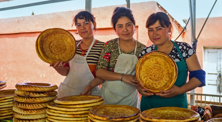 PUNGAN, UZBEKISTAN - MAY 6, 2015: The young girls - bread sellers, poses with the toasted lochira flat breads in rustic food market, on May 6 in Pungan.