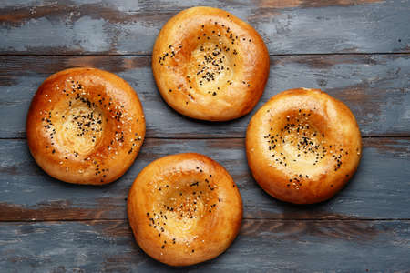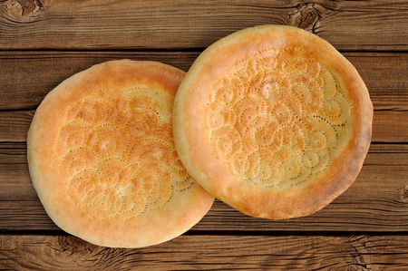 Fatir, uzbek flatbread on old wooden background top view horizontal