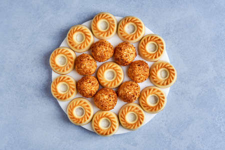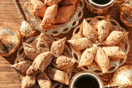 Traditional arabic sweets. Maamoul cookies with dates. Top view