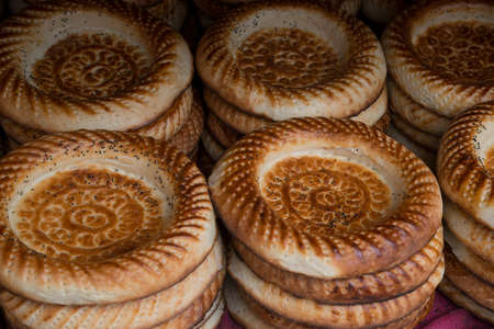 traditional Asian bread Uzbek tandoor flatbread on counter at bazaar in Uzbekistan