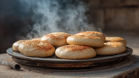 This captivating image showcases freshly baked round bread steaming on a rustic bakery counter, emphasizing the warmth and delicious aroma of traditional baking.