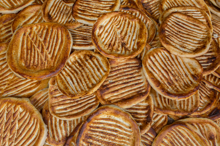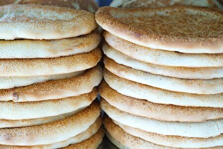 Beautiful view of the food. A beautiful, original background, a view of flat breads lying in the marketplace.