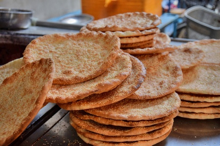 Typical traditional flatbread with crunchy crust with sesam just baked in tandoor on market display of old bakery. Fresh yummy flavored bread from clay tandoor for sale. Tandoor tortillas