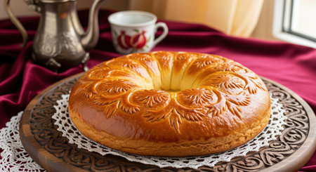 Traditional Armenian sweet bread gata with beautiful patterns on a carved wooden board with lace doily. Festive homemade pastry on table.