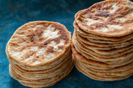 Flatbread lavash, chapati, naan, heap of tortilla on a blue background Homemade flatbread stacked.