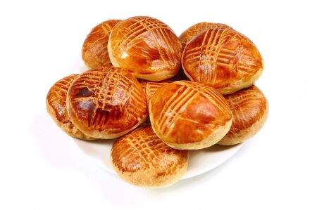Christmas buns in the shape of a pine cone in on a wooden trading tray on a white background. Baked buns trading.