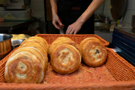 A Guo Kui, Crispy stuffed flatbread is truly scrumptious with flaky and crispy layers on the outside and a flavorful filling on the inside food, happy vendor arranging. Chengdu street food, China.