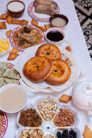 Asian bread baursak and ethnic hat on the carpet in yurta