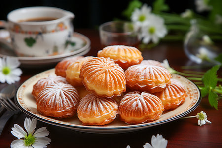 Madeleine cakes, French pastry on wooden table , photo realistic, AI generated