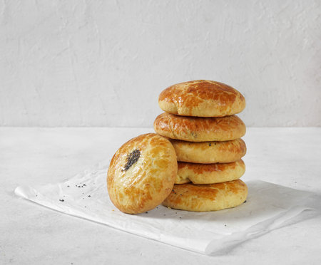 Belyasha homemade baking with meat on a white rustic wooden table. Side view.